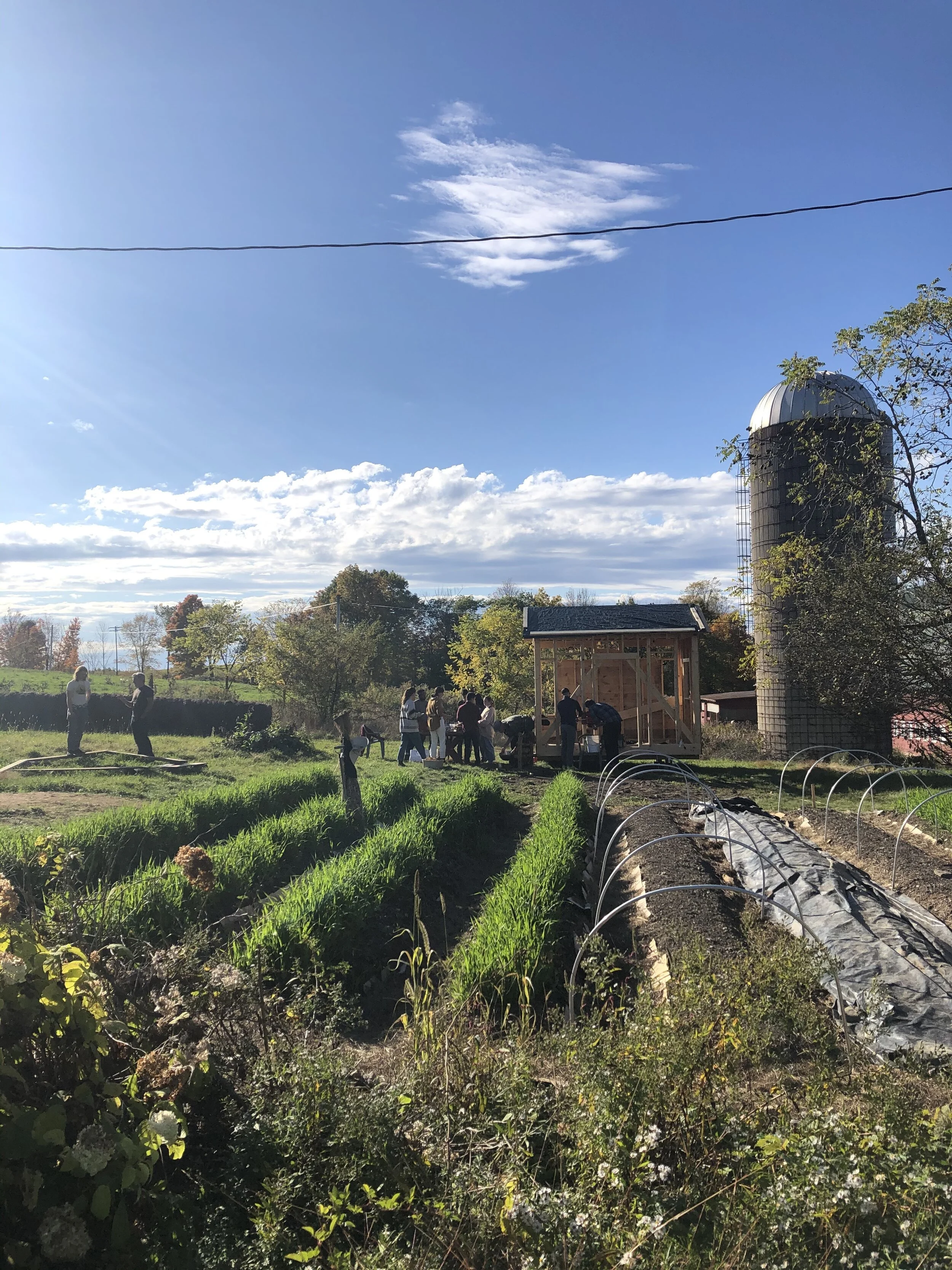 the Earth is the color of milk chocolate, and there are plenty of rocks. the soils hold the memories of all the past stewards of this place, and now they too hold ours. on the south lawn behind the house, you’ll find a 7 row garden encapsulated within a deer fence built with laughter and sweat. you’ll find raspberry bushes to the east, a grove of abundant plum trees just south, two beehives, four compost piles, a well, an herb garden in the making, baby chestnut trees, baby mulberry trees, and an apple tree in need of pruning. the black walnut tree is proud and abundant, as are the lilac bushes soon to bloom. the maples and white pines live just north of the house, the latter whose needles have invigorated our immune systems all winter and spring. we have two tiny houses we built from local lumber and reclaimed materials— a garden shed and a personal practice space— that were constructed over the course of 4 months by my housemates, Paul (our building instructor), and myself. there’s also 1,024 native perennial starts in a precarious hoop house right now, awaiting their journey into the warm ground of late May. and lastly, if you cross the electric fence that lines the perimeter of our home, you can play with a really silly and friendly bunch of teenage cows on pasture, as my housemates and I do on sunny afternoons.